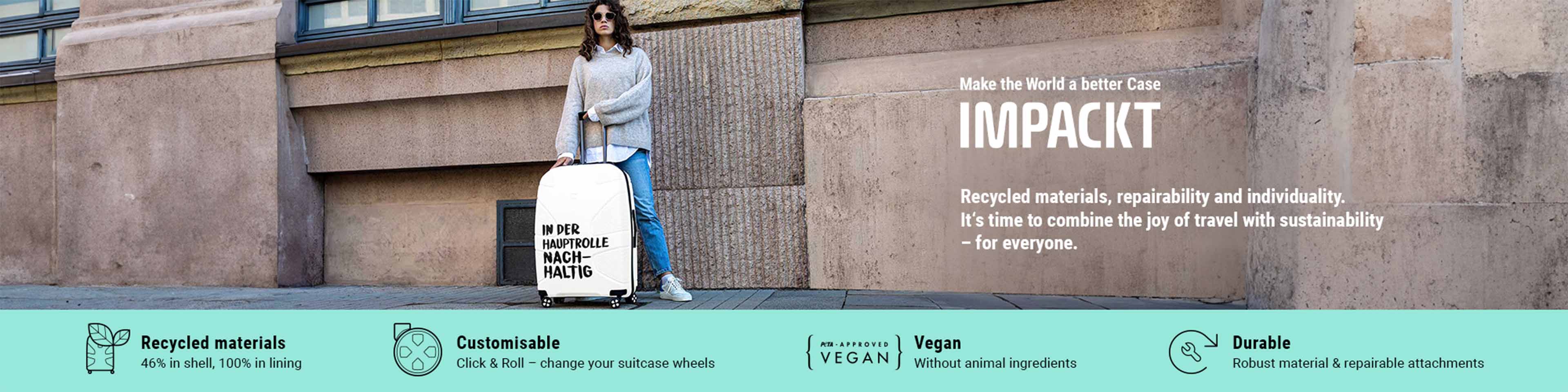 Impackt stands for future-ready travel with responsibility and style. The brand combines modern aesthetics with eco-conscious manufacturing, offering travel luggage, trolleys and beauty cases that are not only practical but also make a clear sustainability statement. As part of the Travelite family, Impackt draws on decades of luggage expertise and impresses with smart features, durable construction and a strong commitment to recycled materials. If you want to buy an Impackt suitcase, you're choosing a premium product with a maximum share of recycled content – without compromising on function or design. Colour options range from understated Iron Grey to vibrant Flora Pink and bold Sunset Yellow – tailored to every travel style and occasion.